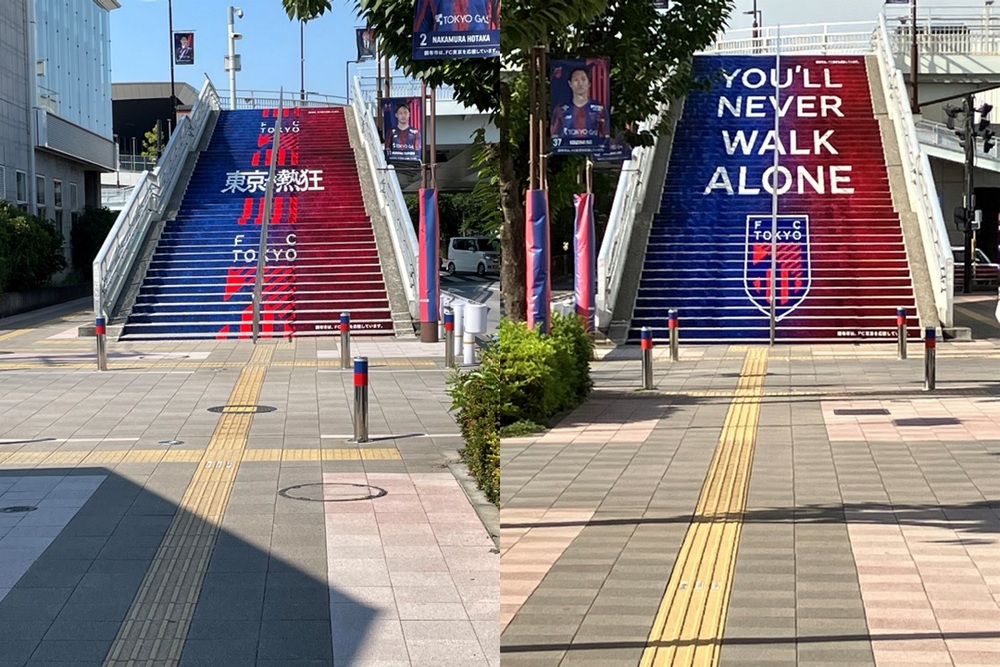 6月16日(日)「調布の日」開催に合わせ、今年も飛田給駅周辺(ペデストリアンデッキ階段)の青赤ドレッシングを実施しました。飛田給駅周辺がさらに青赤に染まります。ぜひ現地でご覧ください。