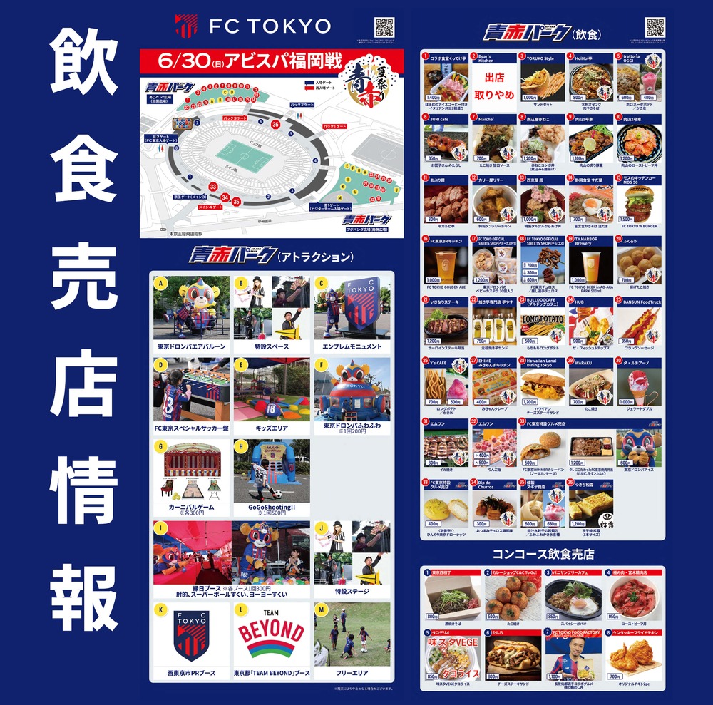 6月30日(日)アビスパ福岡戦の青赤パーク(場外)、出張!!青赤パーク、スタジアム内コンコース(場内)売店にて販売する飲食情報をお知らせいたします。