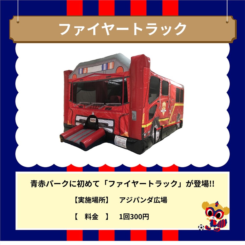 この日は青赤パークにふわふわ遊具「ファイヤートラック」が初めての登場!ぜひお楽しみください。