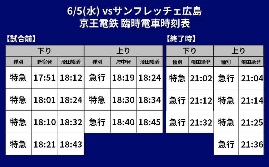 6月5日(水) 2024 JリーグYBCルヴァンカップ プレーオフラウンド 第1戦 vsサンフレッチェ広島(19:00キックオフ/味の素スタジアム)にて運行される臨時交通アクセス(鉄道)、シャトルバス・路線バスについてご案内いたします。