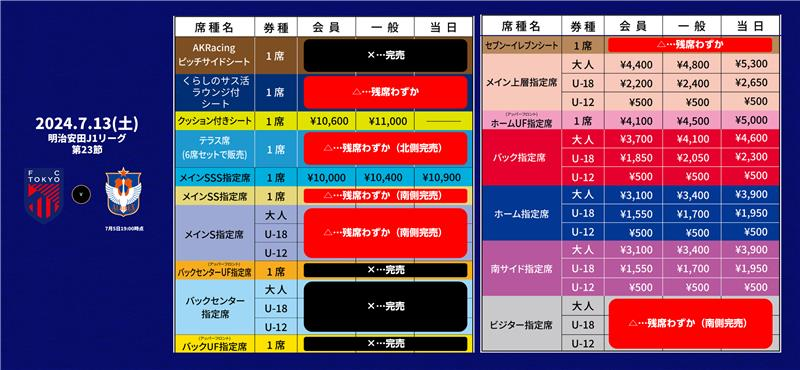 ※現在、チケットFC東京の販売表記が「〇」となっている場合でも、並び席の在庫数が残りわずかとなっている席種がおおくなってきておりますので、ご来場を検討いただいている場合、お早目のチケット取得をオススメいたします。