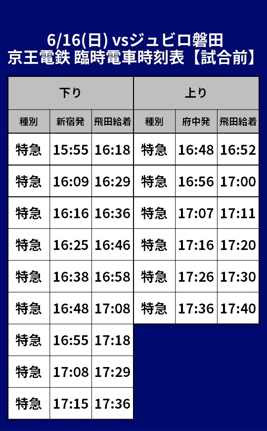 6月16日(日) 2024明治安田J1リーグ 第18節 vsジュビロ磐田(18:00キックオフ/味の素スタジアム)にて運行される臨時交通アクセス(鉄道)、シャトルバス・路線バスについてご案内いたします。