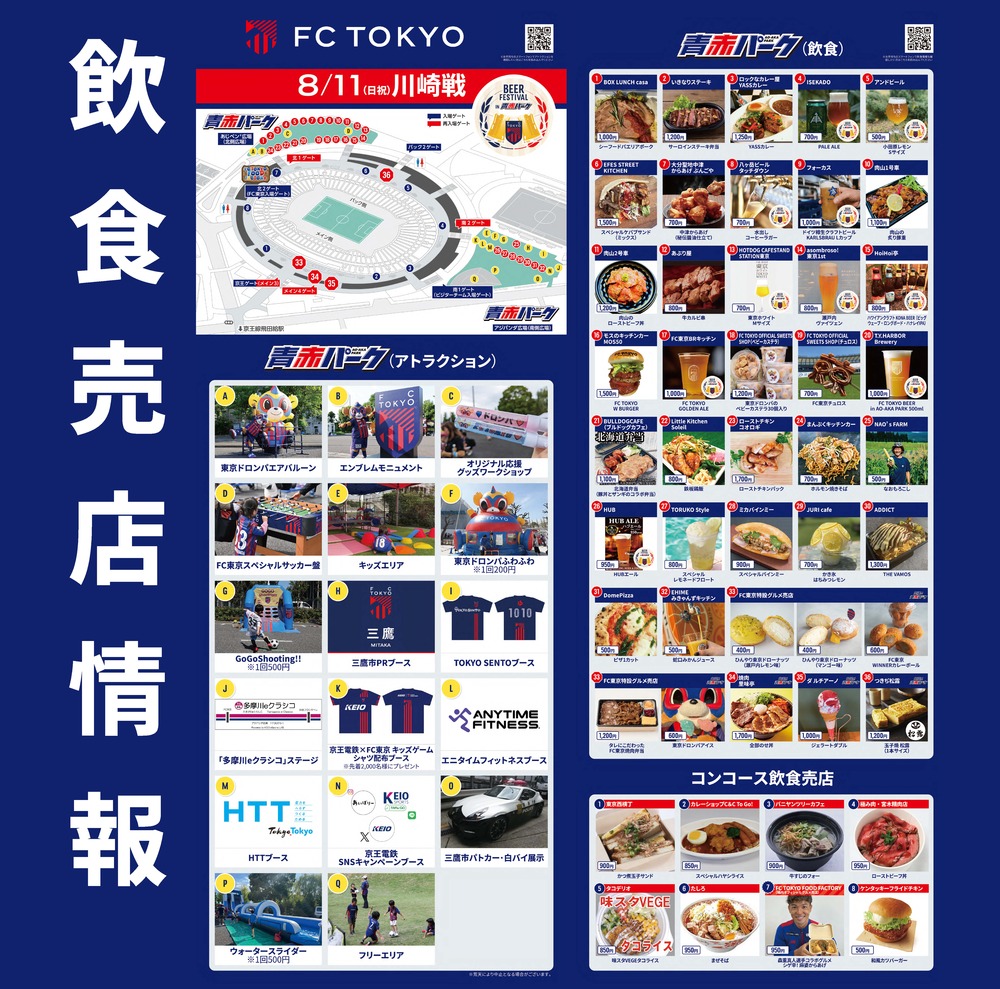 8月11日(日祝)川崎フロンターレ戦の青赤パーク(場外)、出張!!青赤パーク、スタジアム内コンコース(場内)売店にて販売する飲食情報をお知らせいたします。