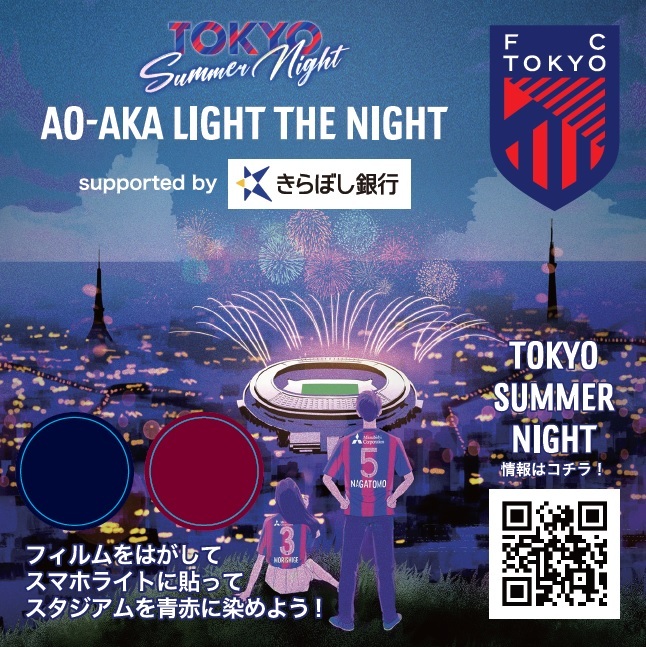 TOKYO SUMMER NIGHTの一環として、7月13日(土) 2024明治安田J1リーグ第23節vsアルビレックス新潟戦 (19:00キックオフ/国立競技場)において、クラブのオフィシャルパートナーである「株式会社きらぼし銀行」のご協賛をいただき、『AO-AKA LIGHT THE NIGHT supported by きらぼし銀行』ステッカーを来場者先着40,000名様に配布いたします。