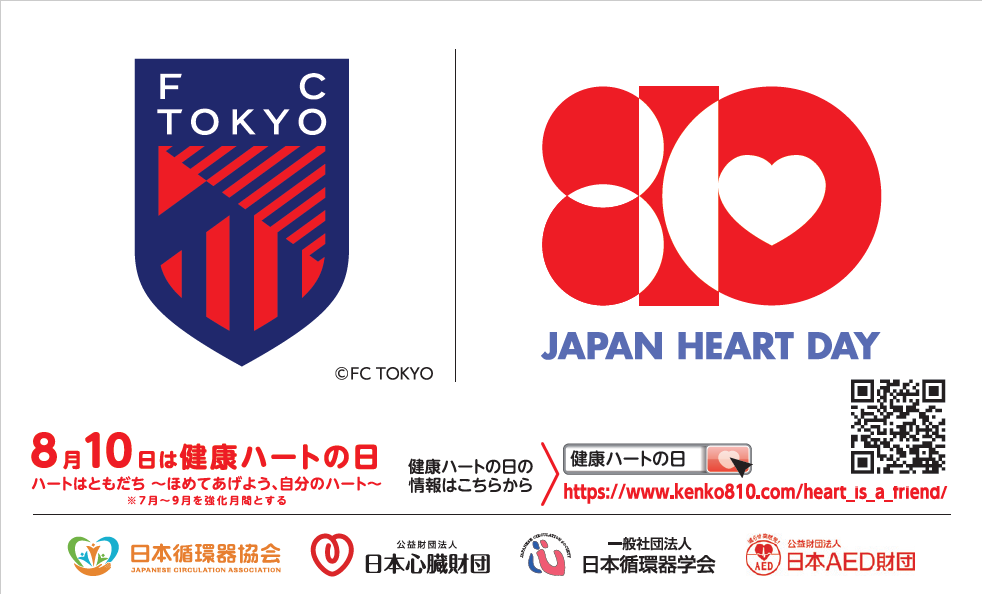 7月13日(土) 2024明治安田J1リーグ 第23節 vsアルビレックス新潟(19:00キックオフ/国立競技場)において、健康ハートの日実行委員会と協力し、心臓病・脳卒中などの循環器病の予防啓発事業「健康ハートの日」のPRを実施いたします。当日はぜひ特設PRブースにお立ち寄りください。