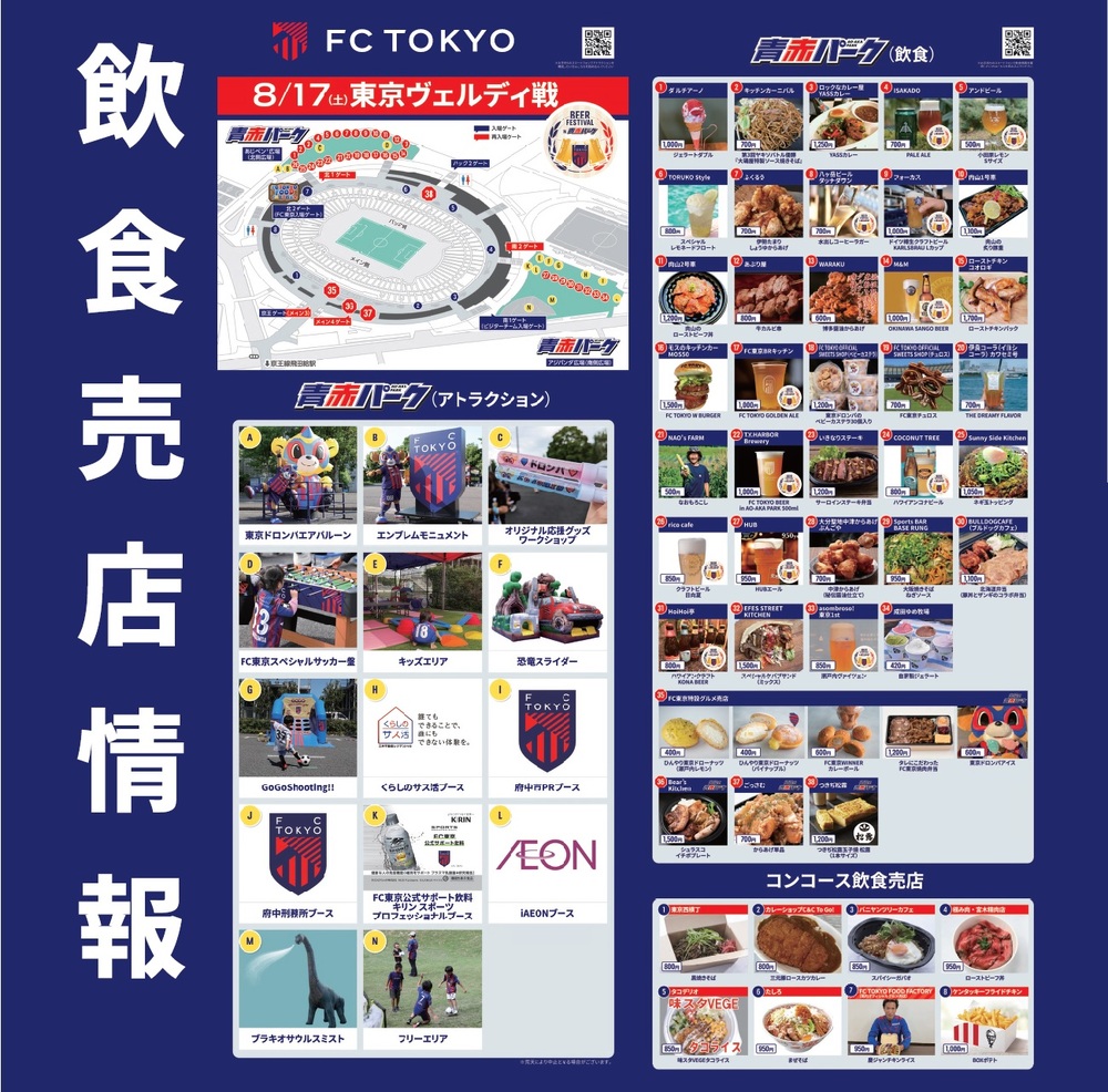 8月17日(土)東京ヴェルディ戦の青赤パーク(場外)、出張!!青赤パーク、スタジアム内コンコース(場内)売店にて販売する飲食情報をお知らせいたします。