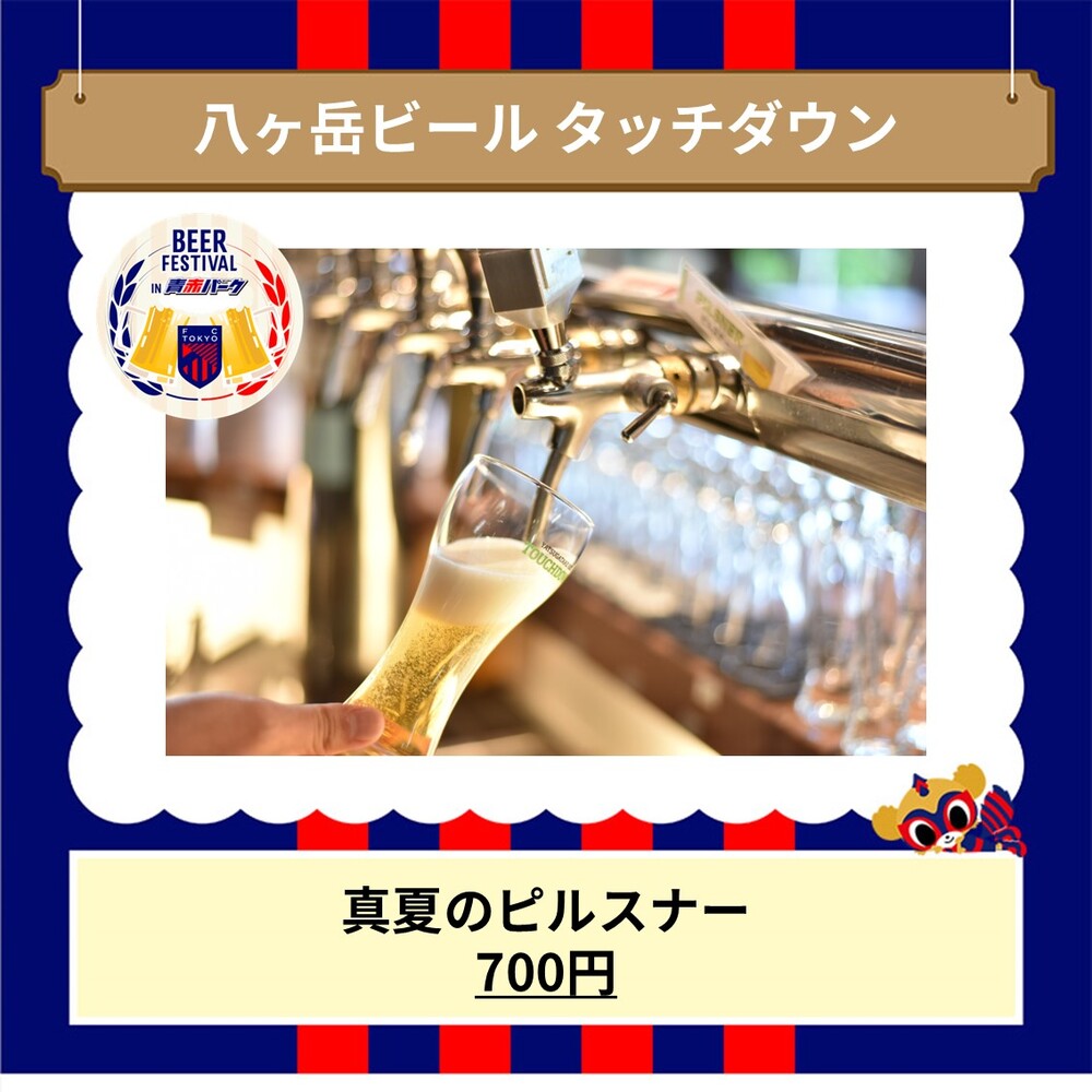 ・八ヶ岳ビール タッチダウンの「水出しコーヒーラガー」は、8月11日(日祝)川崎フロンターレ戦にて完売したため、8月17日(土)東京ヴェルディ戦では「真夏のピルスナー」を販売いたします。