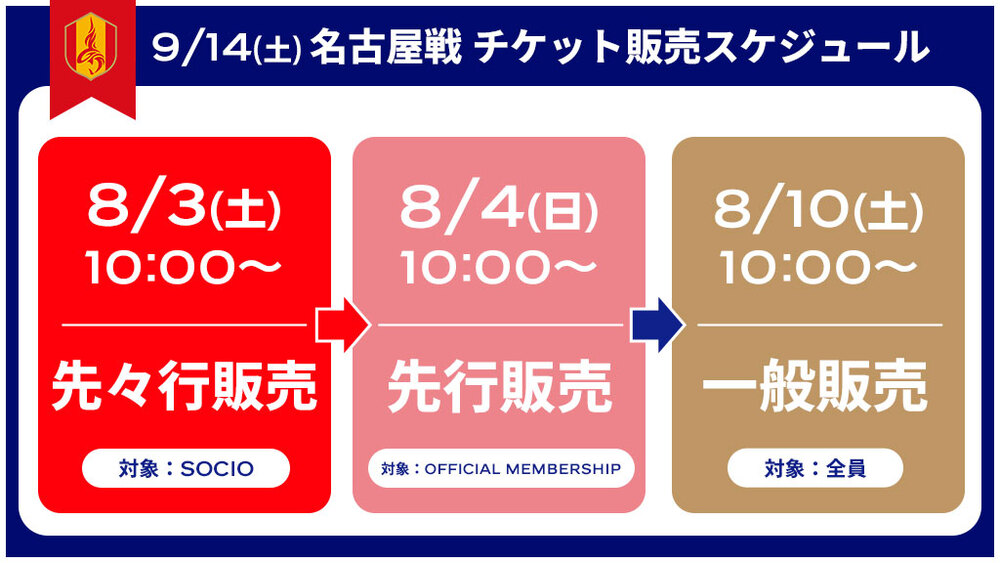 8月3日(土)よりSOCIO先々行販売を開始いたします。SOCIOのみなさまは会員価格にてご購入いただけます(1試合4枚まで。店頭発券/店頭支払いをご選択いただき、期限までにお支払いいただかなかった場合は、お申し込み頂いた枚数分権利を使用したことになりますので予めご了承ください)。