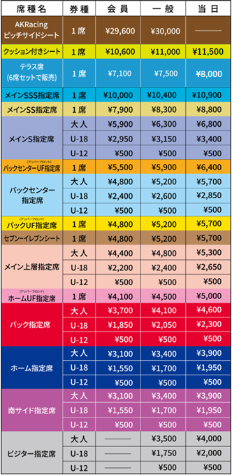 ※U-18料金は2006年4月2日生まれ以降の方、U-12料金は2012年4月2日生まれ以降の方が対象となります。未就学のお子様は保護者のお膝の上での観戦に限りチケットは必要ありません