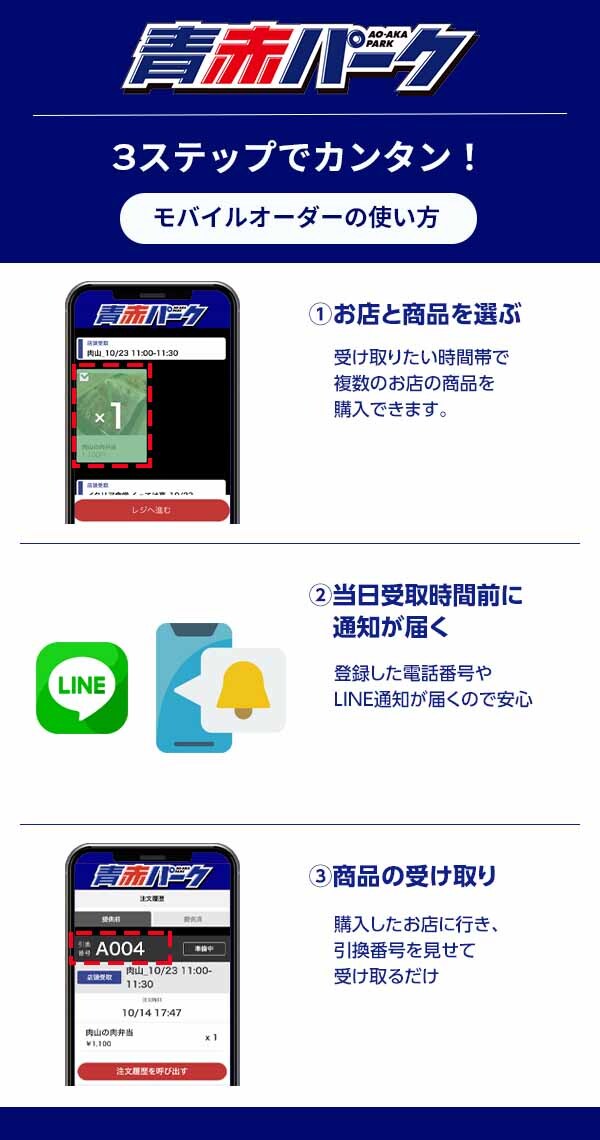 ・指定した時間の約5分前にSMSもしくはLINEにて呼出通知がシステムから送られます。商品引換時には呼出通知、もしくは注文履歴の引換番号をご提示ください。