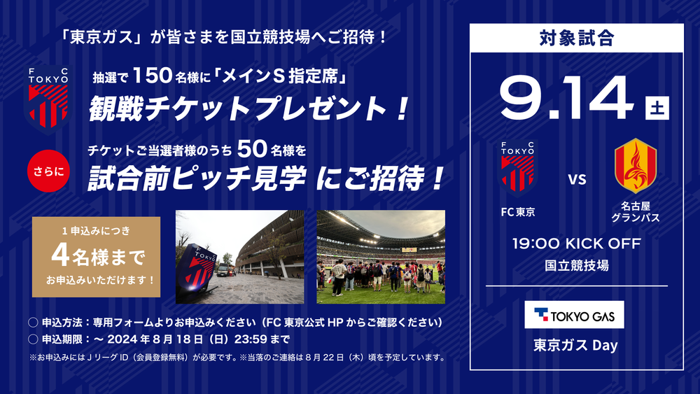『東京ガス Day』の開催を記念し、「東京ガス株式会社」がみなさまを国立競技場へご招待!「メインS指定席(北側)」の観戦チケットを抽選で150名様にプレゼント!さらに、チケットに当選された方の中から抽選で50名様を、ピッチレベルでチーム練習をご見学いただける「試合前ピッチ見学」にご招待します!