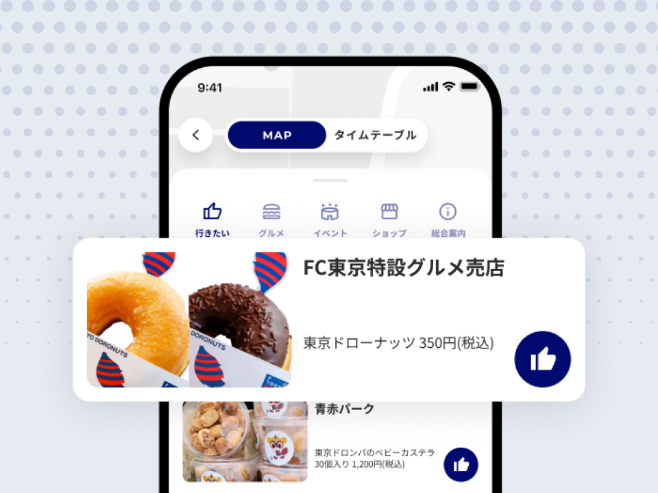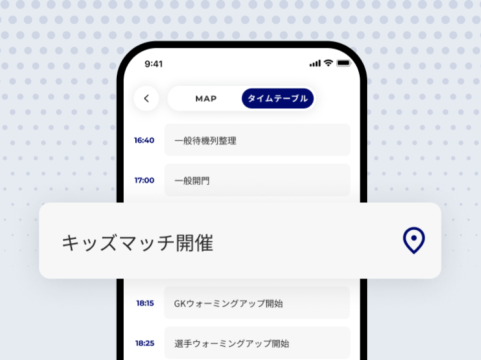 スタジアム内で展開されるグルメやグッズの店舗情報に加え、試合日のタイムテーブルもアプリ一つで確認することができます。さらに、行きたいショップやイベントをチェックすることで、自分だけの観戦リストを作成できます。