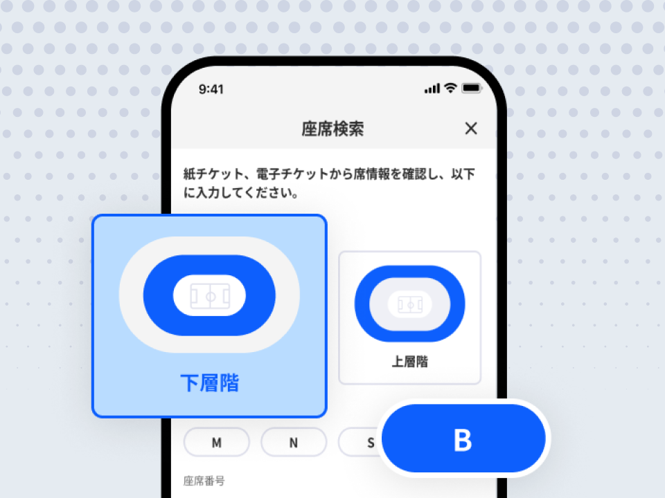 座席番号を入力するとマップ上に座席が表示されます。広いスタジアム内でも自分の座席を迷わずに見つけられます。