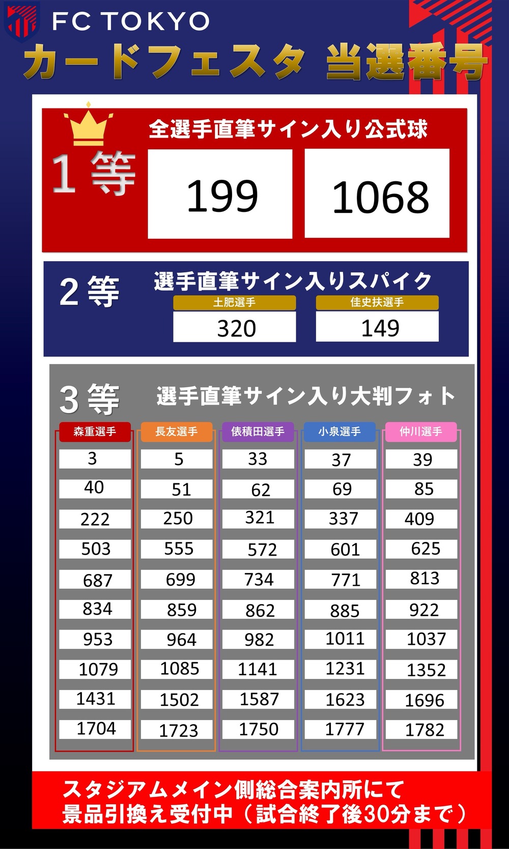 当選番号は、クラブ公式HPおよびグッズ売店にて発表いたします。当選番号と同じ番号の「抽選券」をもって、カードフェスタ当選景品交換窓口(メイン側総合案内所)へお越しください。