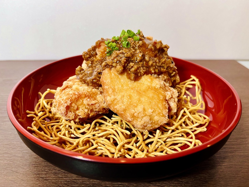 下にはパリパリの揚げそばを敷き、一皿で二度美味しいメニューとなっております。