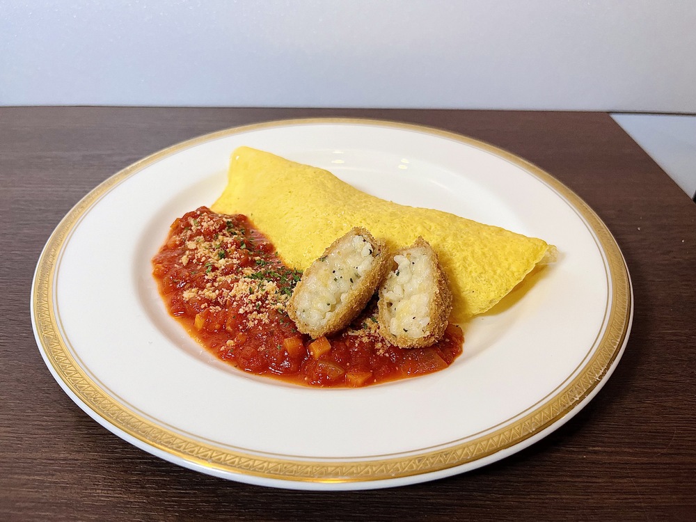 チーズリゾットのライスコロッケを薄焼き卵で包み、自家製のトマト&バジルソースを使用した、佳史扶選手大好きなオムライス仕立てにしました。