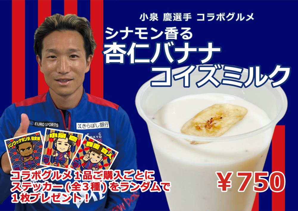 ・10月5日(土)サガン鳥栖戦から、「FC TOKYO FOOD FACTORY」にて、小泉慶選手コラボグルメ「シナモン香る杏仁バナナコイズミルク」の販売が決定しました。