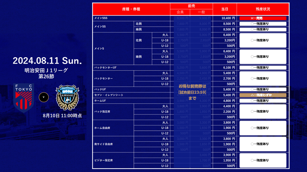 2024明治安田 J1リーグ 第26節 FC東京 vs 川崎フロンターレ(19:00キックオフ/味の素スタジアム)の当日券販売につきまして、下記のとおりお知らせいたします。