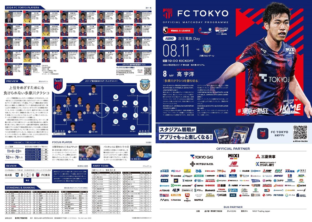 8月11日(日祝) 2024明治安田J1リーグ 第26節 vs川崎フロンターレ(19:00キックオフ/味の素スタジアム)のオフィシャルマッチデープログラムについて、下記のとおりご案内いたします。