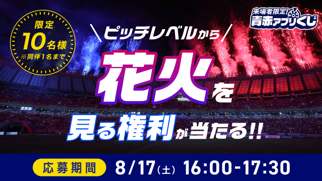 『ピッチレベルから花火を見る権利』が当たる来場者限定「青赤アプリくじ」開催のお知らせ