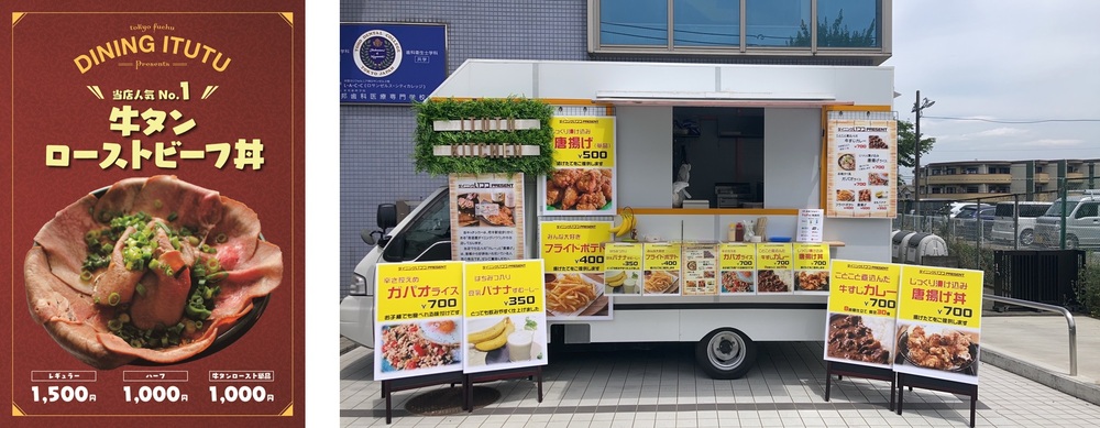当キッチンカーは、府中駅徒歩1分にある「ダイニングいつつ」の移動販売車として出店しております。お店の人気メニューをキッチンカーで販売できるためラインナップもとても豊富です。府中産の野菜など地産地消、地域に根付いたお店作りをコンセプトにしています。