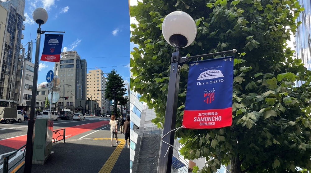 また、今回より新たに信濃町の左門町振興会との連携で外苑東通り四谷三丁目交差点までの街路灯にもフラッグを掲出いただくことになりました。