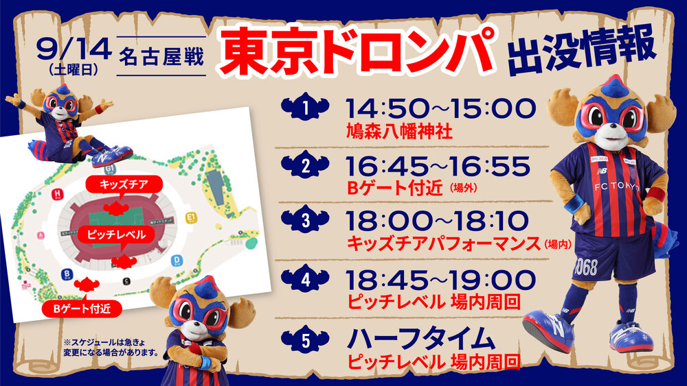 9月14日(土) 2024明治安田J1リーグ 第30節 vs 名古屋グランパス (19:00キックオフ/国立競技場)に東京ドロンパが下記の通りあらわれます。