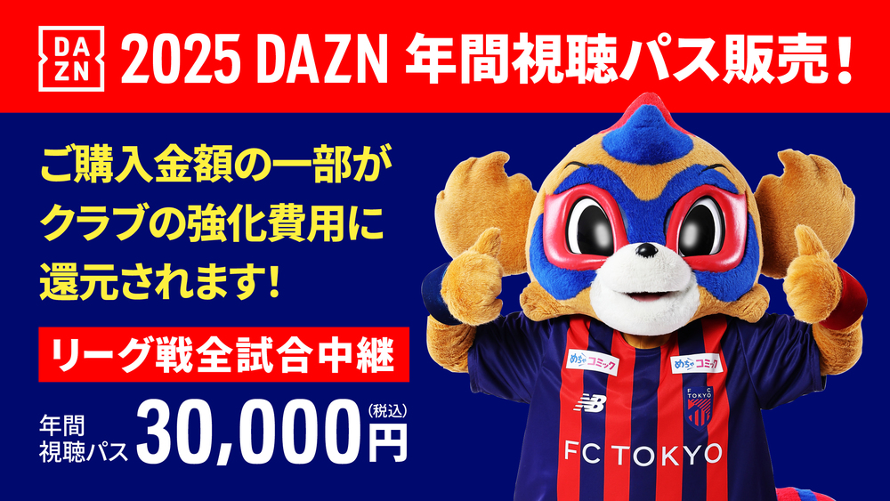 FC東京では、2024年10月1日(火)10:00より、FC東京DAZN年間視聴パス販売特設サイトにて『2025DAZN年間視聴パス』の販売を開始いたします。