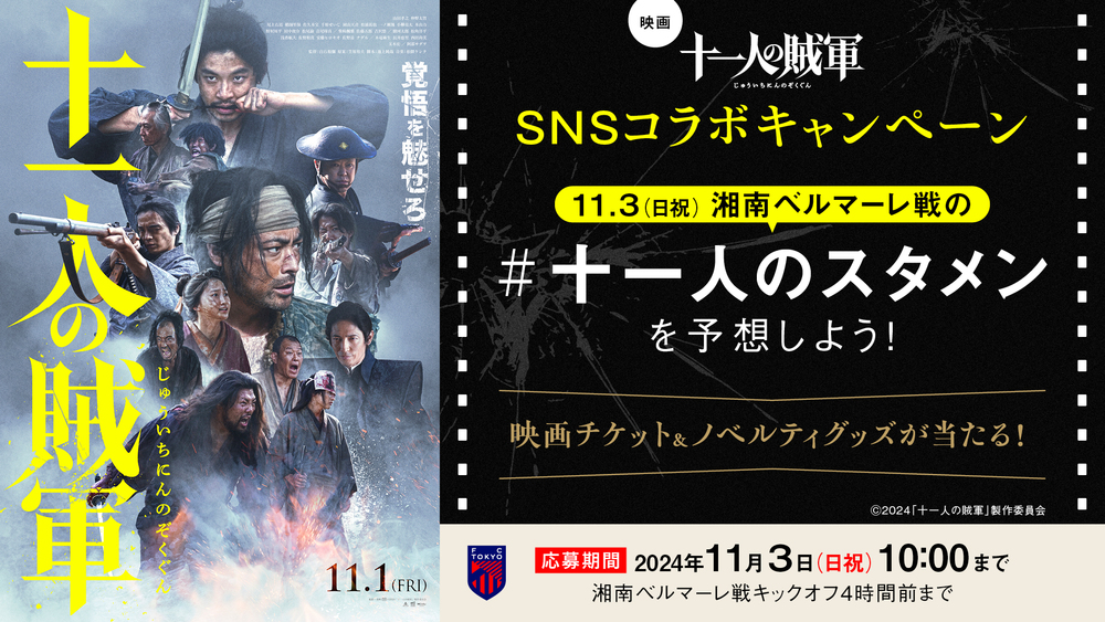 2024年11月1日(金)公開の映画『十一人の賊軍』とFC東京のSNSコラボキャンペーンが下記の通り決定しましたので、お知らせいたします。