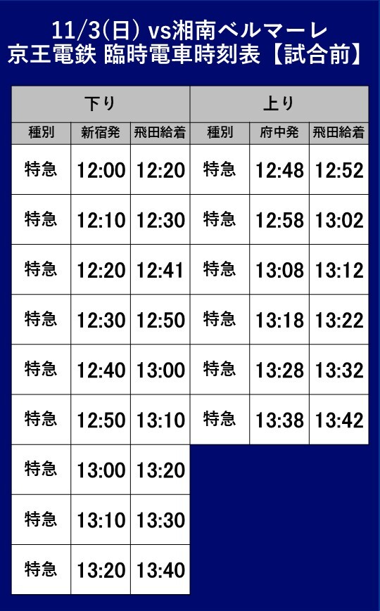 11月3日(日祝) 2024明治安田J1リーグ 第35節 vs湘南ベルマーレ(14:00キックオフ/味の素スタジアム)にて運行される臨時交通アクセス(鉄道)、シャトルバス・路線バスについてご案内いたします。