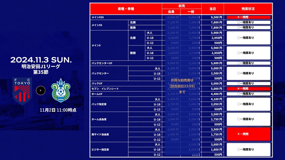2024明治安田 J1リーグ 第35節 FC東京 vs 湘南ベルマーレ(14:00キックオフ/味の素スタジアム)の当日券販売につきまして、下記のとおりお知らせいたします。