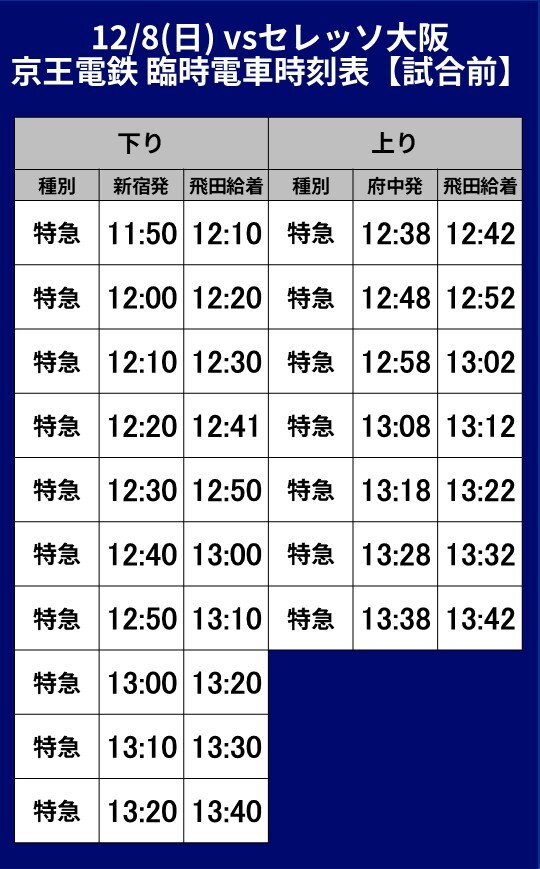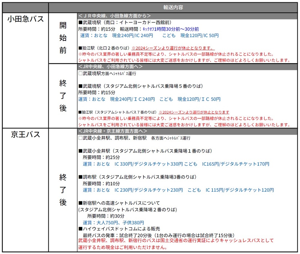 12月8日(日) 2024明治安田J1リーグ 第38節 vsセレッソ大阪(14:00キックオフ/味の素スタジアム)にて運行される臨時交通アクセス(鉄道)、シャトルバス・路線バスについてご案内いたします。