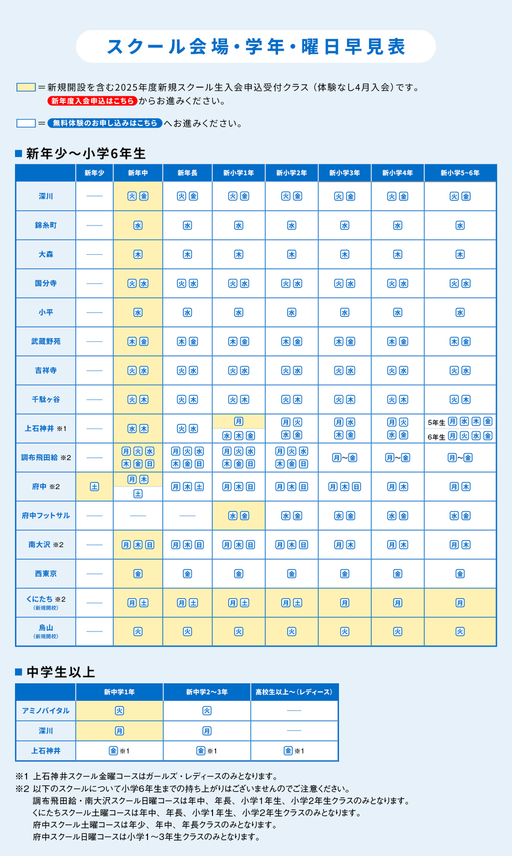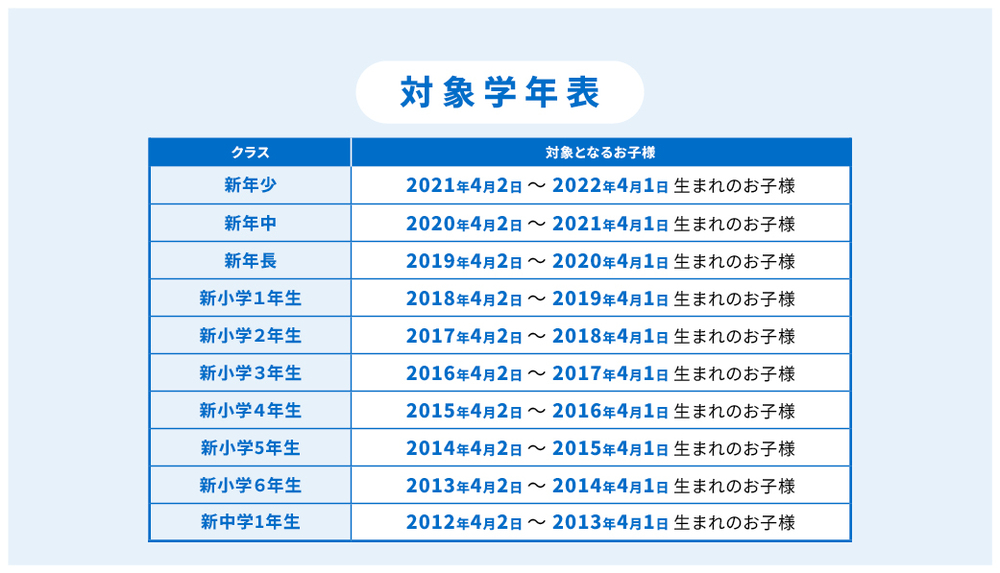 ※くにたちスクールの土曜コースは小学2年生まで、 調布飛田給・南大沢スクールの日曜コースは小学2年生まで、府中スクールの日曜コースは小学3年生までのクラス設定となるため、次の学年になるタイミングで他コースまたは他スクール会場に移動していただく必要がございます。なお、希望先で空きがない場合はキャンセル待ちとなります。