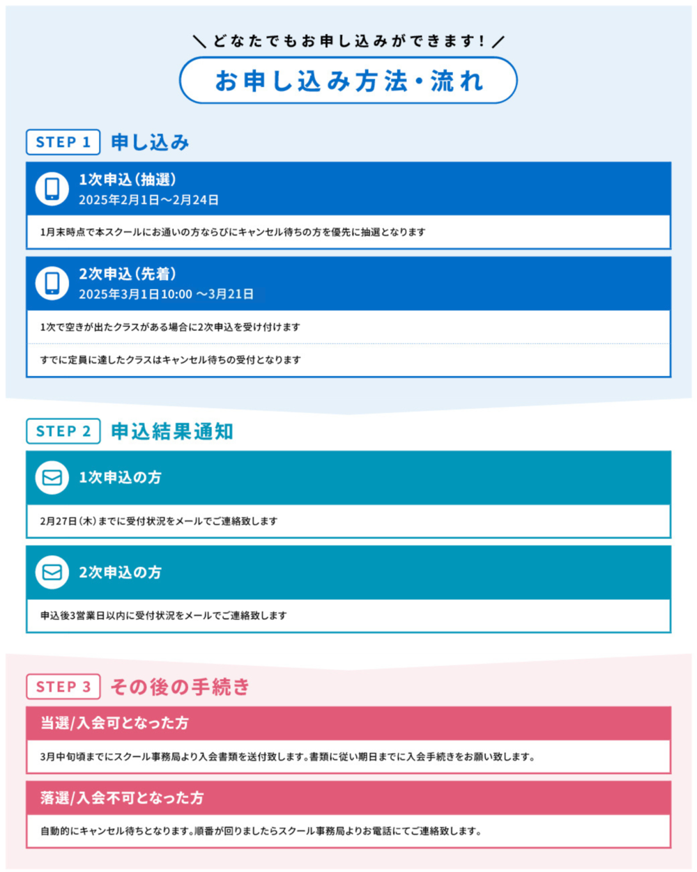 ※事前のスクール体験はできません。体験は4月以降空きがある場合のみ順次受付となります。