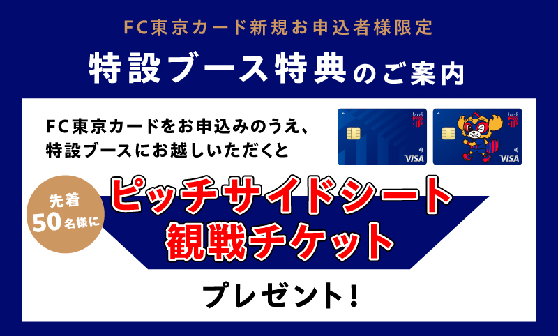 カードお申込み対象期間中にFC東京カードをお申込みのうえ、特設ブースにお越しいただいた先着50名様に「3月29日(土)川崎フロンターレ戦のピッチサイドシート観戦チケット」をプレゼントいたします!