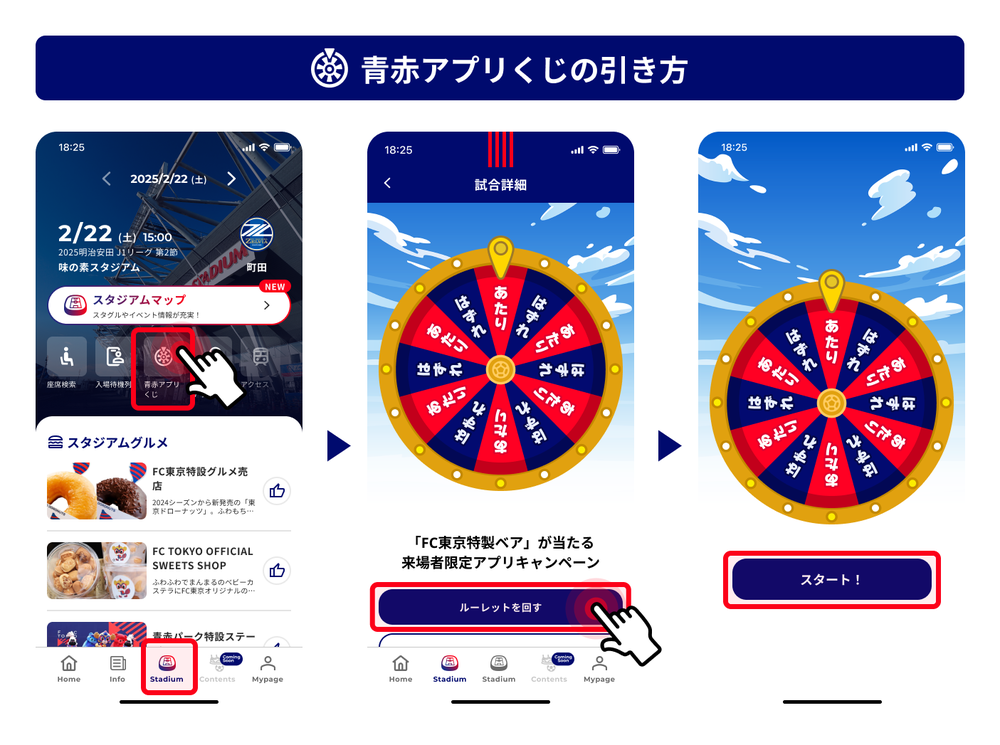 FC東京アプリ内のStadiumタブ内に「青赤アプリくじ」バナーがありますので、クリックしご参加ください。
