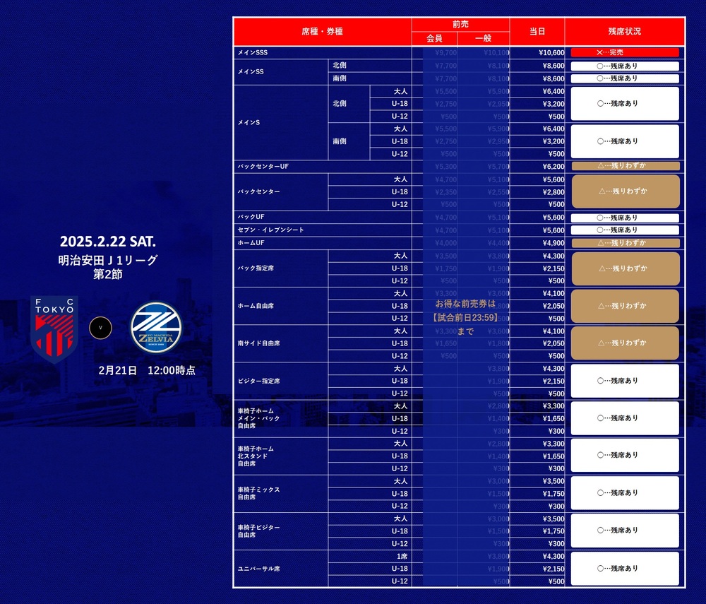 2025明治安田J1リーグ 第2節 FC東京 vsFC町田ゼルビア(15:00キックオフ/味の素スタジアム)の当日券販売につきまして、下記のとおりお知らせいたします。