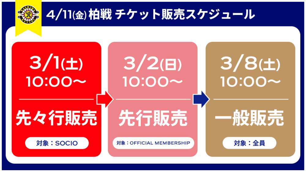 柏戦ご当選のみなさまには3月27日(木)夕方頃に、G大阪戦ご当選のみなさなみは4月3日(木)夕方頃に、JリーグID取得時にご登録いただきました電子メールアドレス宛にご案内させていただきます。