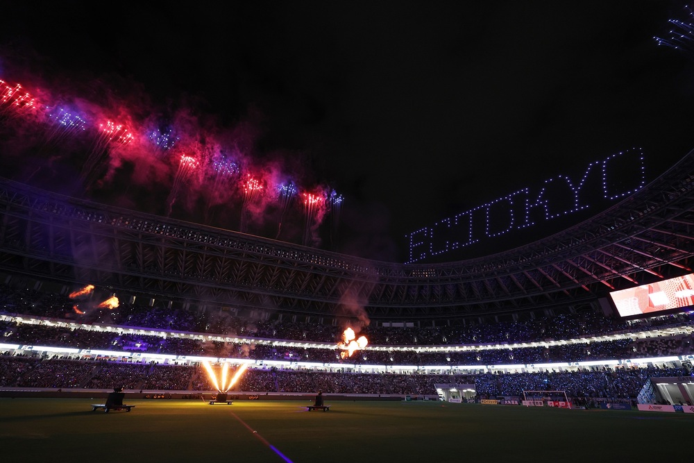 約400機のドローンが国立競技場の上空を飛行する演出に加え、屋根上からは特殊効果花火の打ち上げ、ムービングライトによる照明の演出も行います。