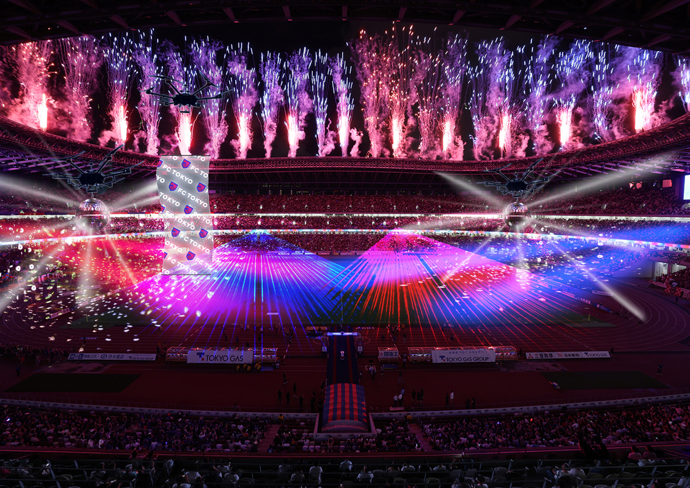 選手紹介や選手入場に合わせ屋根上からの特殊効果花火に加えムービングライトを使用した照明演出や、クラブ史上初となるドローンにミラーボールやLEDビジョンを付けて飛行を行う演出を行います。