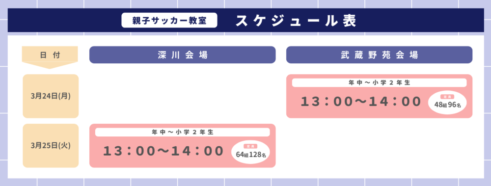 3月24日(月)・25日(火)に年中~小学2年生のお子さまとその保護者の方を対象とした、FC東京普及部コーチによる「親子サッカー教室」を実施します。