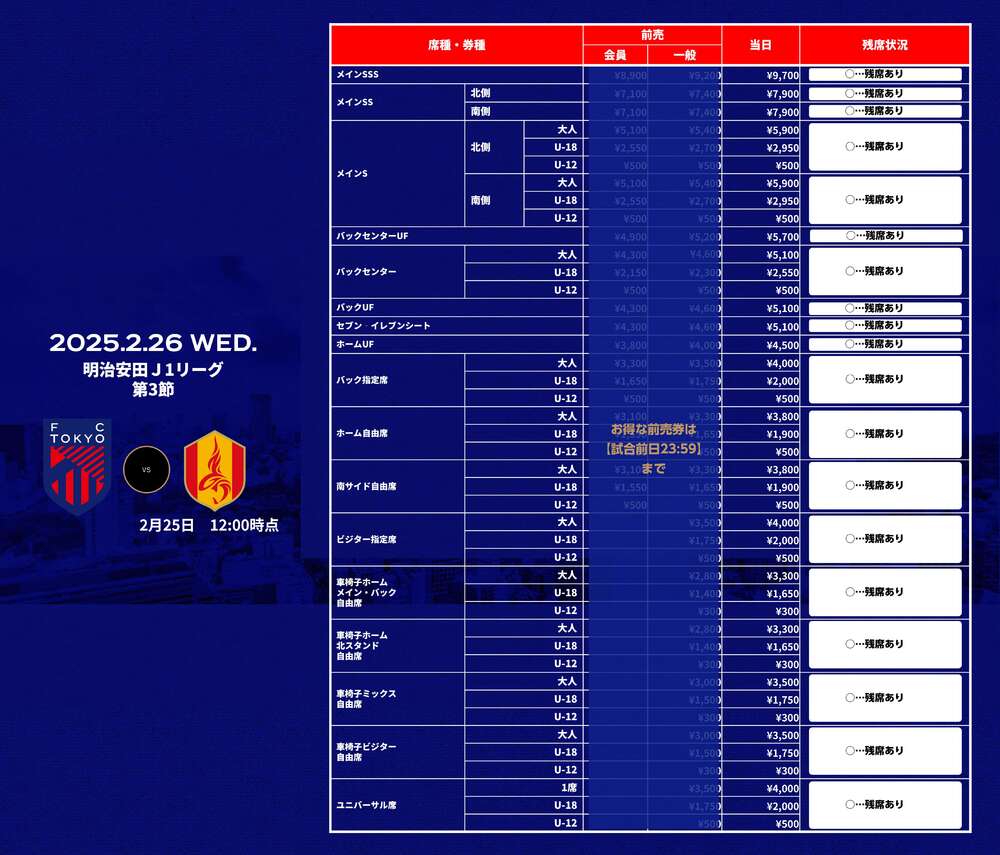 2025明治安田J1リーグ 第3節 FC東京 vs 名古屋グランパス(19:00キックオフ/味の素スタジアム)の当日券販売につきまして、下記のとおりお知らせいたします。