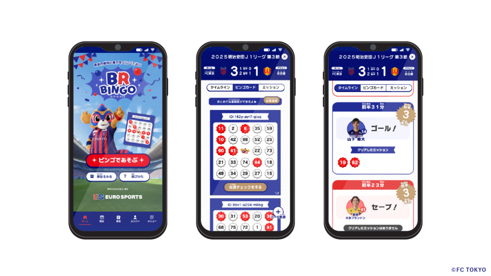 BR BINGOは「前半を失点ゼロで終える」「交代選手がゴールを決める」などの試合中に起こるプレーや出場選手の状況と連動した75個の条件(ミッション)のいずれかに当たると自動的にカードの数字に穴が開くビンゴゲームです。