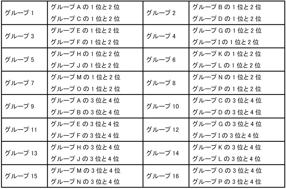 64チームを、4チームずつ16グループに分け、各グループ1回戦総当たりのリーグ戦を行う(各チーム3試合)。