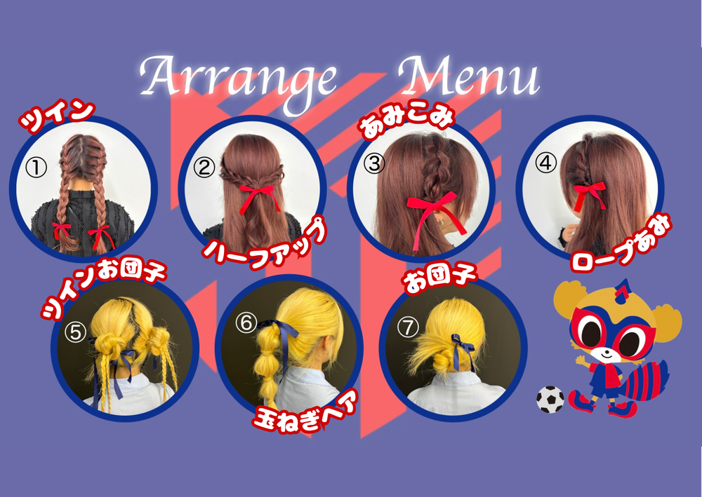 ボディペイントは、お好きな場所にFC東京オリジナルデザインのボディペイントサービスを行わせていただくほか、ヘアアレンジブースでは青赤のリボンなどを使い試合前にヘアアレンジ体験ができるブースを実施します。