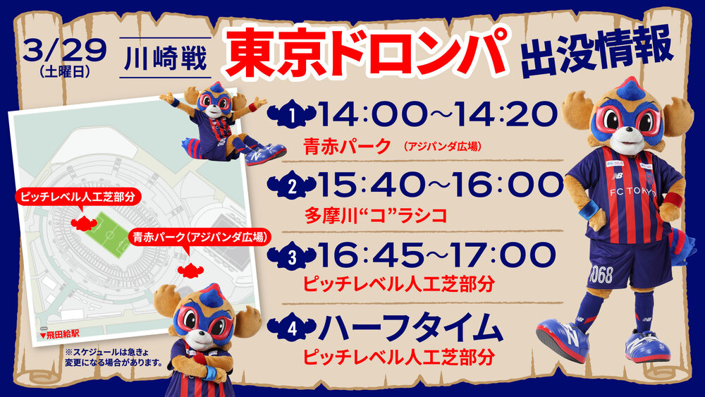 3月29日(土) 2025明治安田J1リーグ 第7節 vs 川崎フロンターレ (17:00キックオフ/味の素スタジアム)に東京ドロンパが下記の通りあらわれます。