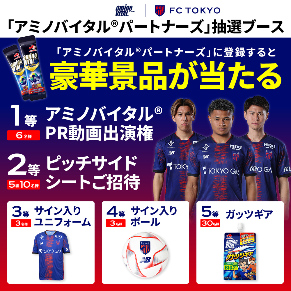 3月29日(土) 2025明治安田J1リーグ 第7節 vs 川崎フロンターレ(17:00キックオフ/味の素スタジアム)において、オフィシャルパートナーである味の素株式会社が「アミノバイタル®パートナーズ」抽選ブースを出展いたします。