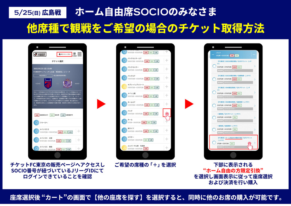 チケットFC東京にて「お座席0円取得、または他席種のチケット取得(席変更・差額金額分での購入) 」をお願いいたします。事前の発券が必要となり、SOCIOカードでの入場はできませんので、あらかじめご了承ください。