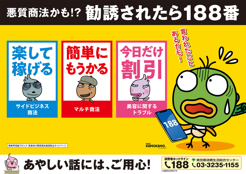 東京都では「若者向け悪質商法被害防止」も含め消費生活に関わる東京都の情報サイト「東京くらしWeb」を通じ都民の消費者被害未然・拡大防止の啓発活動をしています。トラブルに巻き込まれたり、怪しいと思った際は、「消費者ホットライン」188(局番なし)にご相談ください。詳しくは下記ホームページをご確認ください。