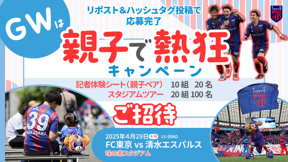 4月29日(火祝)に開催する2025明治安田J1リーグ 第13節 vs清水エスパルス(13:05キックオフ/味の素スタジアム)に向けて、ゴールデンウィークのおでかけ先として、FC東京のホームゲームを、親子でより熱く楽しんでいただけるように、親子限定の特別な体験が当たるキャンペーンを開催いたします。